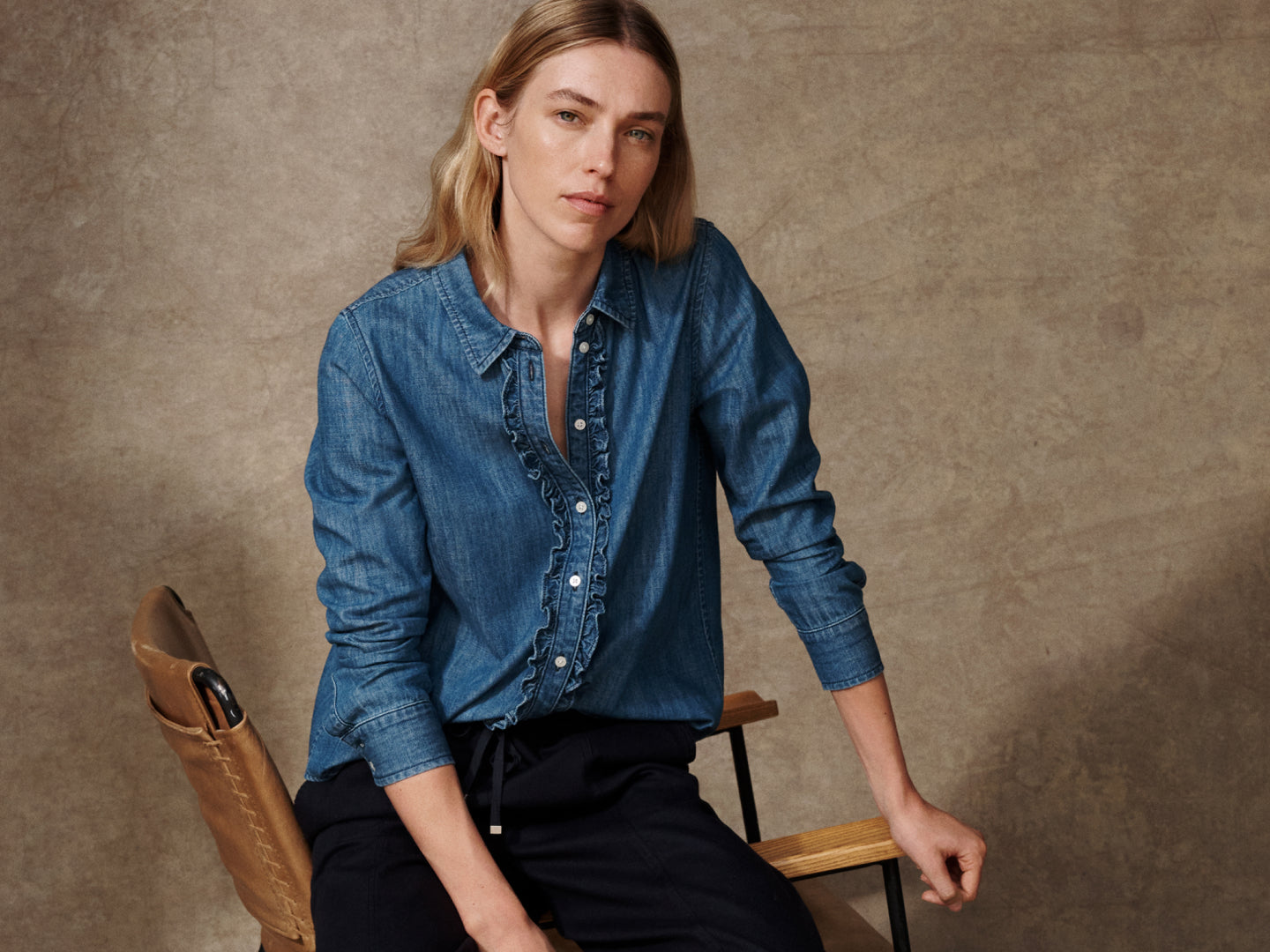 Denim shirts are equally adaptable. Worn open over a fitted tee or tank, they create an easy layered look that works perfectly with knitwear draped over the shoulders. As the temperature drops, they also work beautifully under blazers or structured coats, adding texture without bulk.