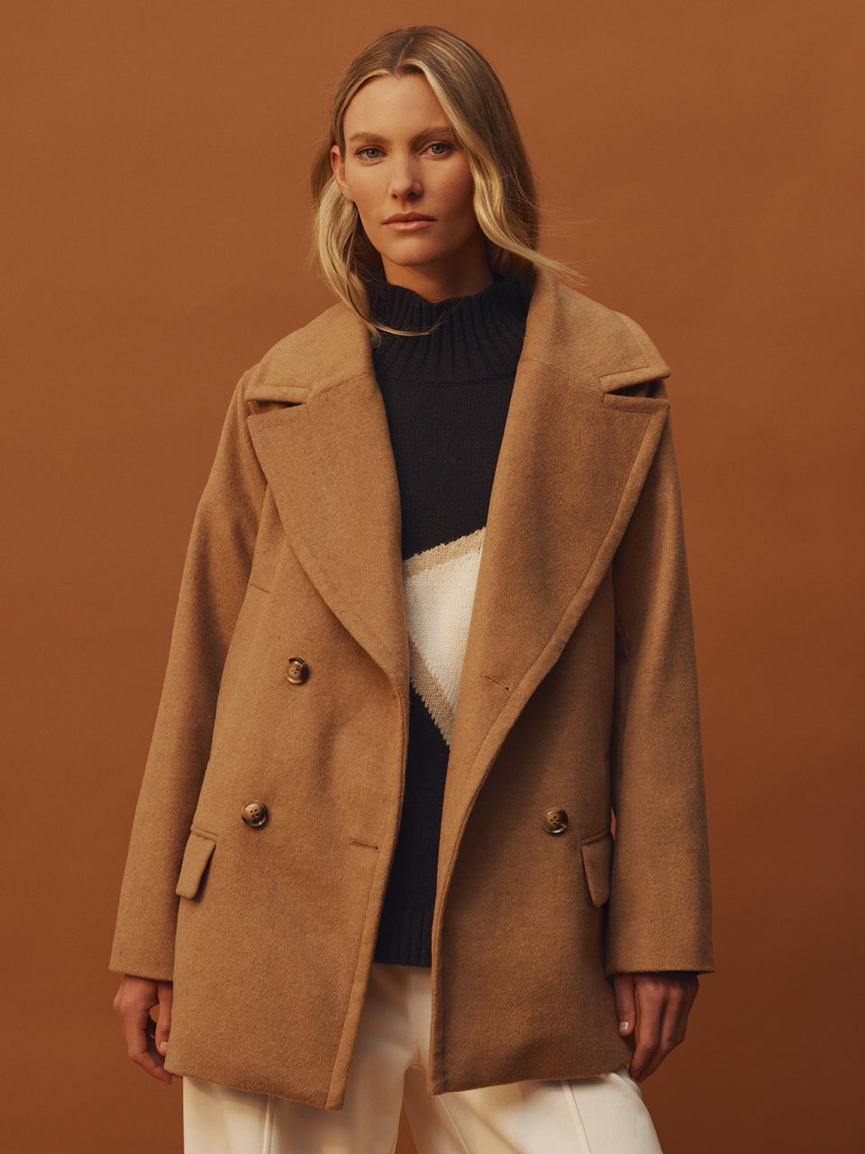 Our Umbra coat in rich sienna, crafted from a soft wool blend featuring wide lapels, will keep you warm on crisp mornings this winter.