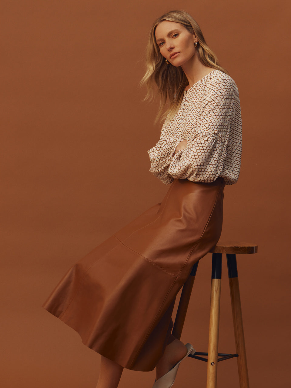 Crafted from high quality genuine leather, the Raw Hide Skirt is a hero piece of this collection. In rich Sienna, this elegant A-line skirt pairs back beautifully with the Lava Top in lightweight viscose. Matching soft leather Raw Hide Jacket in Sienna is also available.