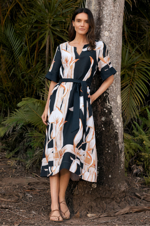 Step into the quiet charm of relaxed summer styling, where serene escapes meet thoughtful design. A calming palette of ginger, crisp white and deep navy sets the tone for this collection. The linen blend Palma dress in this stunning statement print flows beautifully for easy wear.