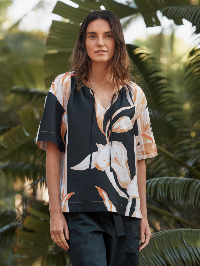A statement print in the key colours of the collection, the Palma Top brings a refined ease to warm weather dressing. Crafted in a soft linen blend with thoughtful design details, the piece pairs beautifully with the relaxed 100% cotton Excelsior Pant.