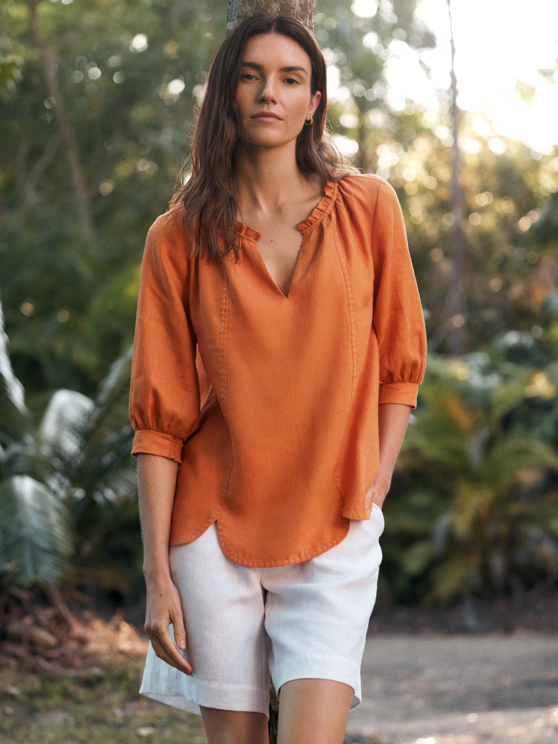 The Riviera Top in vibrant Ginger crafted from soft 100% linen has an effortless bohemian feel. Paired with the tailored Riviera short, this look speaks to elevated casual style