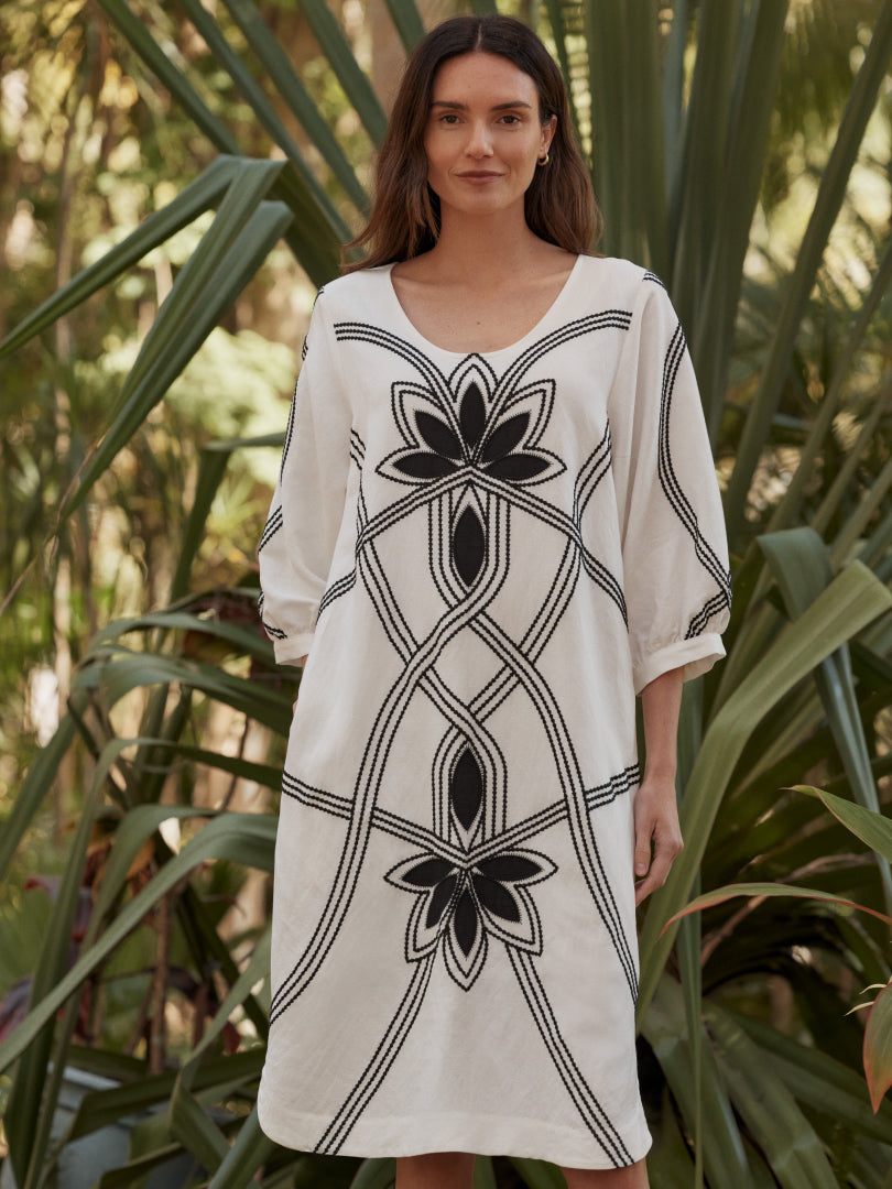 Crafted in a breathable linen blend, the Fiesta Dress brings summer confidence to life. Beautifully finished with contrasting embroidered appliqué, it’s a statement piece designed to captivate.
