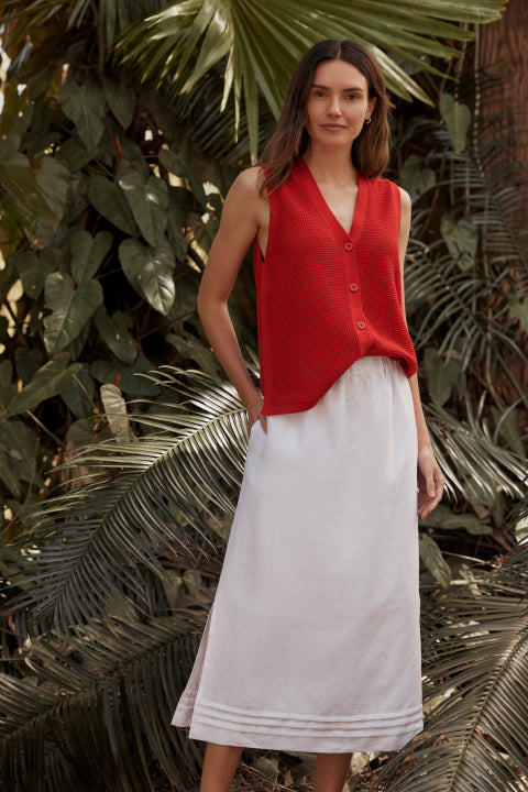 In line with our brand philosophy ‘Founded in Nature,’ the Villa Tank in striking Poppy red is made from 100% organic cotton. This lightweight textured knit pairs beautifully with the 100% linen Kinship Skirt, bringing effortless style to your summer look.