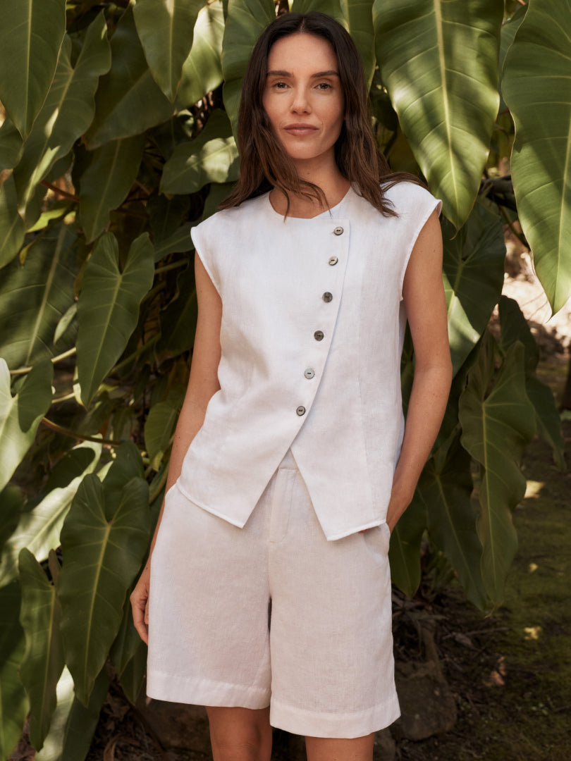 Elegant and casually refined, you’ll love the button detail and lightweight feel of the 100% linen Kinship Vest. Cool and lightweight to wear, this piece pairs beautifully with the Riveria shorts, the matching Kinship Skirt or even your favourite denim.