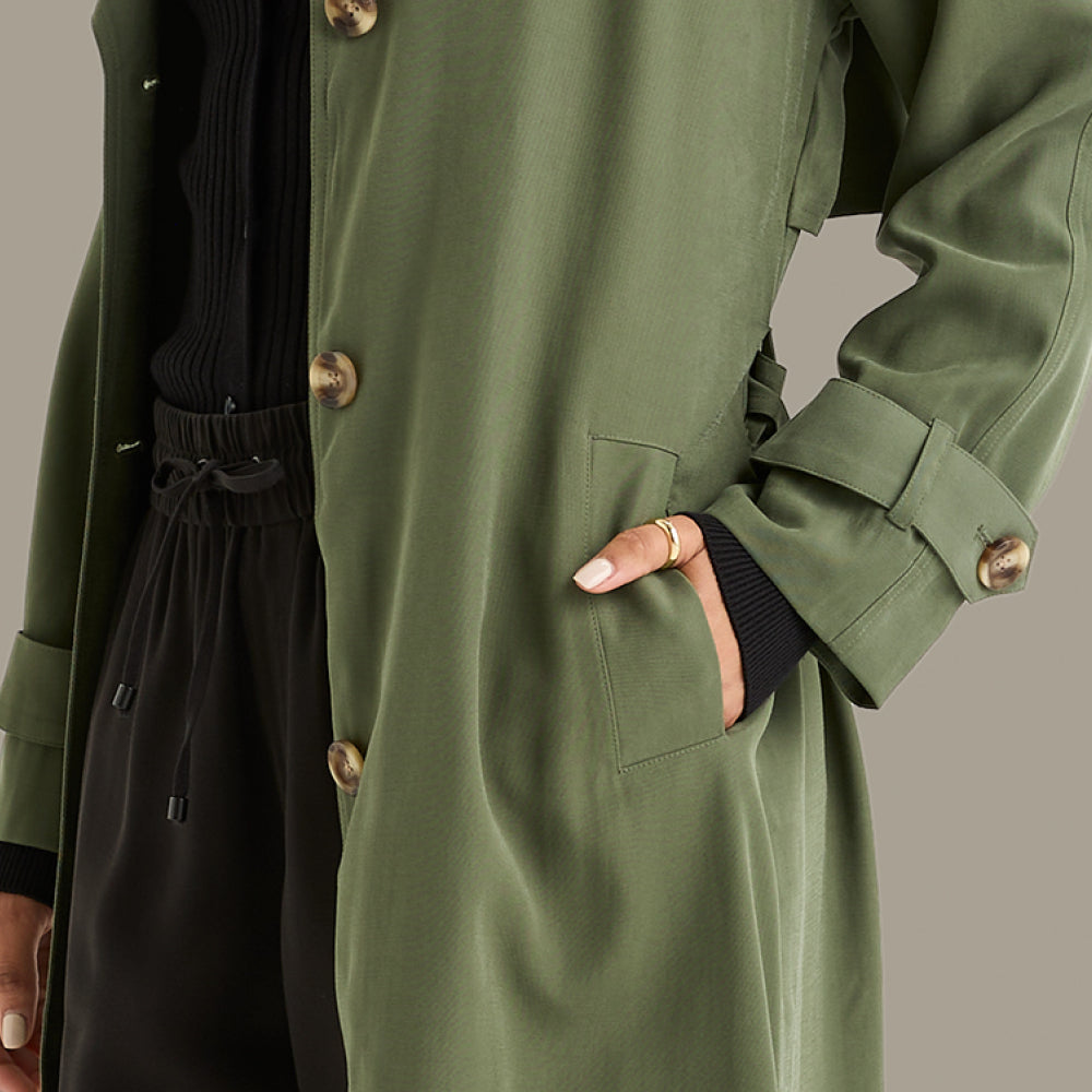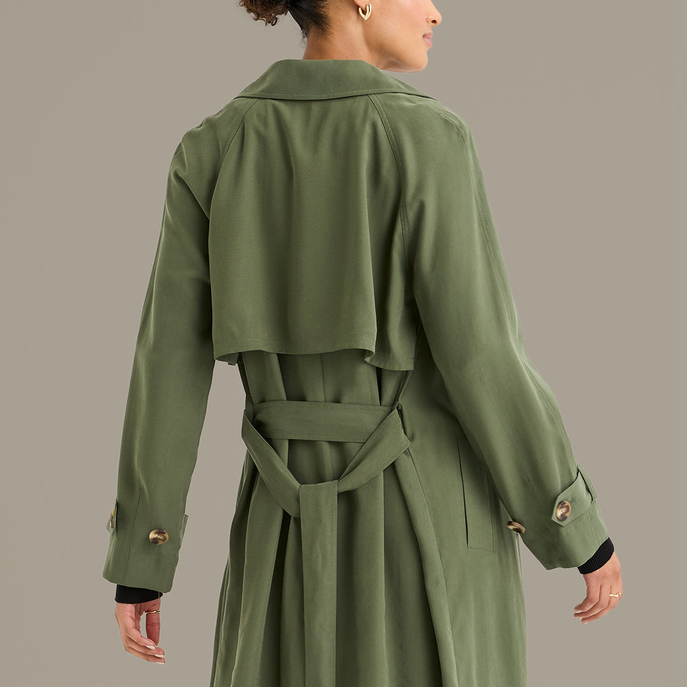 This modern trench coat, crafted from Viscose blended fabric, is ideal for a stylish, on-the-go look. It showcases a wide collar and lapel and falls below knee length, offering an elevated silhouette. The long raglan sleeves, cuff straps, waist ties, and front buttons add both functionality and chic detail. For a fresh look, pair it with a white shirt and wide-leg pants, or layer it with colourful pieces for a fun seasonal twist!